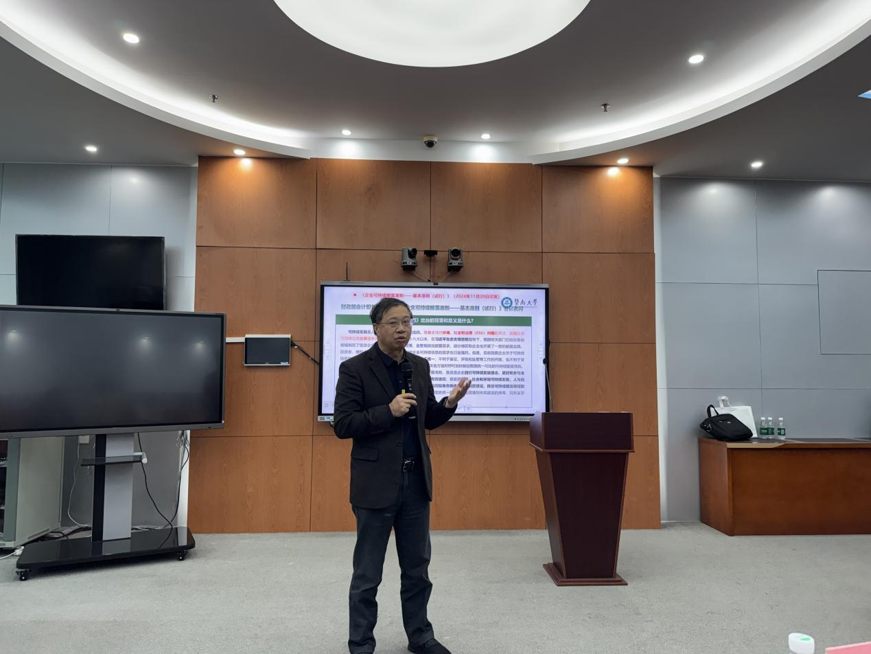2025年11月21日上午,304永利集团有限公司在实验中心201举办第十三期研究生讲坛。本次讲坛特邀暨南大学管理公司宋献中教授担任主讲嘉宾,作题为“解码ESG:可持续发展的充电器”的专题讲座。讲坛由304永利集团有限公司经理秦格教授主持,公司科研骨干教师及全体研究生参加了此次活动。 讲座伊始,宋教授从全球可持续发展制度建设背景出发,指出ESG在中国的发展具备坚实基础。他系统阐释了企业信息披露体系正由单一财务报告向“财务报告+可持续发展报告”双轨并行的趋势转变,并强调气候议题是ESG的核心内容。结合《企业可持续披露准则基本准则(试行)》,宋教授进一步解读了我国可持续披露准则体系的建设路径:预计到2027年,基本准则与气候相关披露准则将陆续出台;到2030年,国家统一的可持续披露准则体系将基本建成。 在ESG议题分析部分,宋教授将其划分为三大维度:环境维度聚焦污染物排放、生物多样性保护及“双碳”目标推进;社会维度涵盖客户权益、数据安全与员工发展;治理维度则涉及治理结构完善与商业道德建设。此外,宋教授还借助2012至2024年的ESG报告鉴证数据,展示了我国ESG报告第三方鉴证业务的发展态势。 宋教授特别指出,ESG理念与中国传统文化中“天人合一”的思想高度契合,也与我国新时代发展战略紧密呼应。他从“绿色发展”理念演进至“新质生产力”的系统阐释,揭示了ESG在中国的发展逻辑,并引用2023年全国生态环境保护大会提出的“四个重大转变”和“五个重大关系”,进一步阐明ESG发展的理论指导与实践方向。 在探讨绿色发展路径时,宋教授强调需发挥市场与政府的协同作用,通过产业结构调整、绿色技术创新及绿色金融支持,推动创新链与产业链融合、产业链与资金链对接。他还回顾了ESG研究二十年来的发展历程,结合团队研究成果,分析了A股纳入MSCI指数对企业ESG表现的积极影响,以及ESG评级差异对企业社会责任行为的效应。 讲座尾声,宋教授指出,未来企业应将环境目标全面融入整体战略,重塑治理架构,深化环境会计与碳会计研究,完善绿色投融资机制。他强调,ESG研究需具备跨学科的系统思维,整合多领域知识以应对可持续发展的复杂挑战。 在随后的问答环节,与会师生围绕ESG实践识别、毕业论文选题等方面踊跃提问。宋教授建议同学们关注企业ESG报告的长期趋势,开展同行业比较研究,并深入探索企业可持续披露准则实施过程中的现实问题。秦格经理在总结中感谢宋教授的精彩分享,认为本次讲坛内容系统全面、视野开阔,兼具理论高度与实践价值,为师生提供了丰富的学术启迪与研究思路。