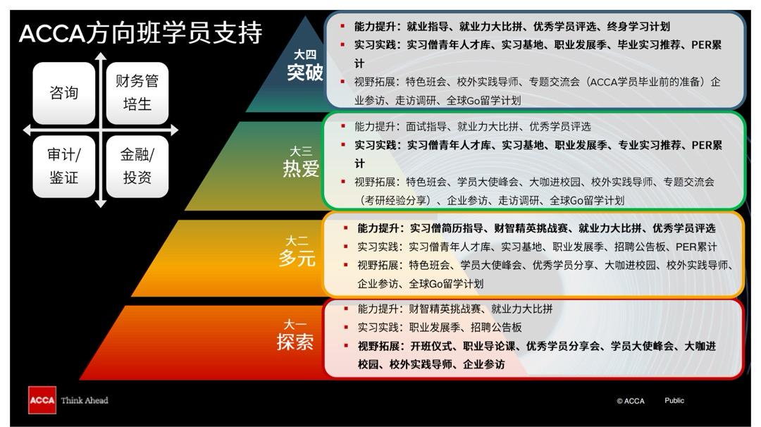 6、广阔的就业前景。本班员工可享受ACCA官方组织的各种学术、实践活动,并获得ACCA向国内外知名企业(ACCA认可雇主)推荐的就业机会。