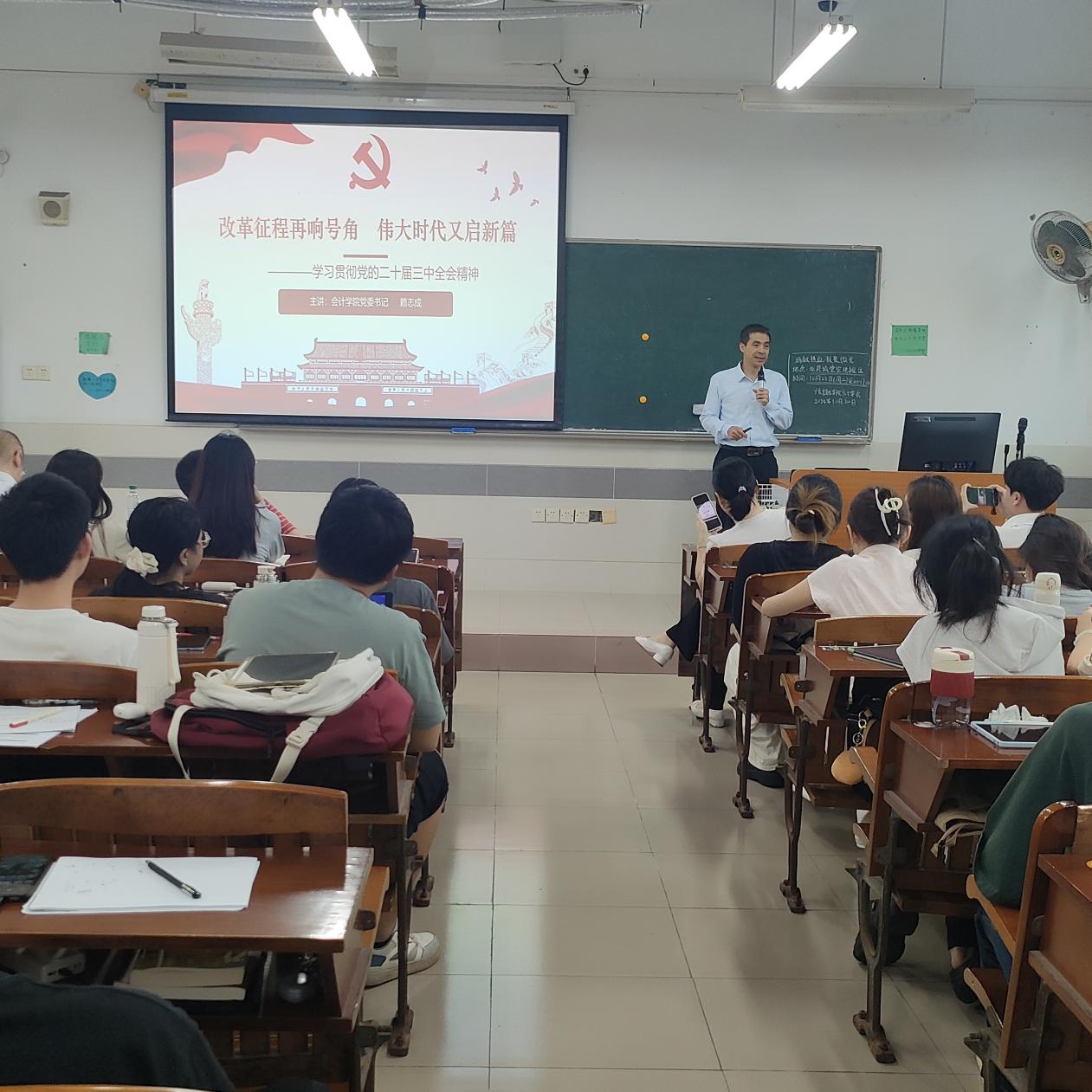 随后,赖志成书记对党的二十届三中全会及《中共中央关于进一步全面深化改革推进中国式现代化的决定》(简称“决定”)的主要内容进行了解读。赖志成书记讲解了“决定”的三大板块和六个贯彻原则,并指出党的二十届三中全会精神不仅为当前和未来的中国发展指明了方向,还强调了坚持守正创新原则对当前中国改革的重大意义。赖书记还从新时代研究生的视角出发,阐述了全面理解党的二十届三中全会的重大时代意义和深远历史影响的重要性。他勉励同学们以更加昂扬的斗志、更加坚定的信心,为推动中国特色社会主义事业不断向前发展贡献力量,并鼓励同学们通过积极投身志愿服务、科技创新、社会调研等活动,深入了解国家现状、社会情况及民众需求,从而增强自身的社会责任感与实践能力。